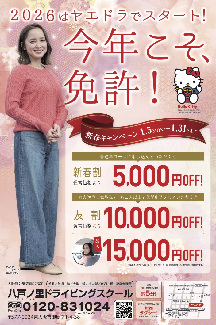 キャンペーン実施中! Contents キャンペーン ニュース 学科配当表 Latest キャンペーン実施中! FM大阪 新番組「CLASS SEVEN SDD CONNECT」... 1月の学科配当表をアップ致しました 12月の学科配当表をアップ致しました 各種教習、講習の休止のお知らせ 過去のトピックス一覧 2026 (1) 2025 (5)