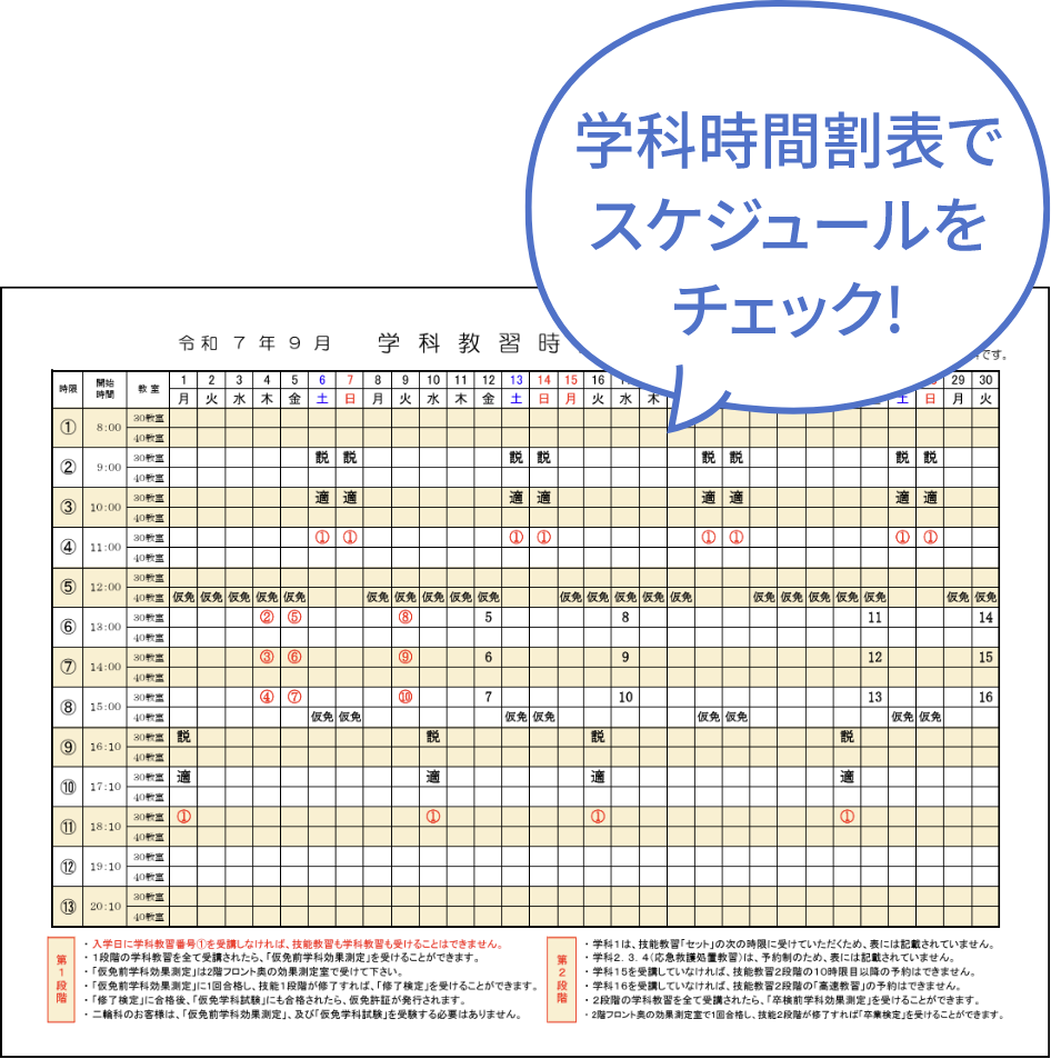 ヤエドラでは、学科教習・技能教習ともに、効率よく学べるカリキュラムと、経験豊富なインストラクターによる指導で、一発合格を全力でサポート。