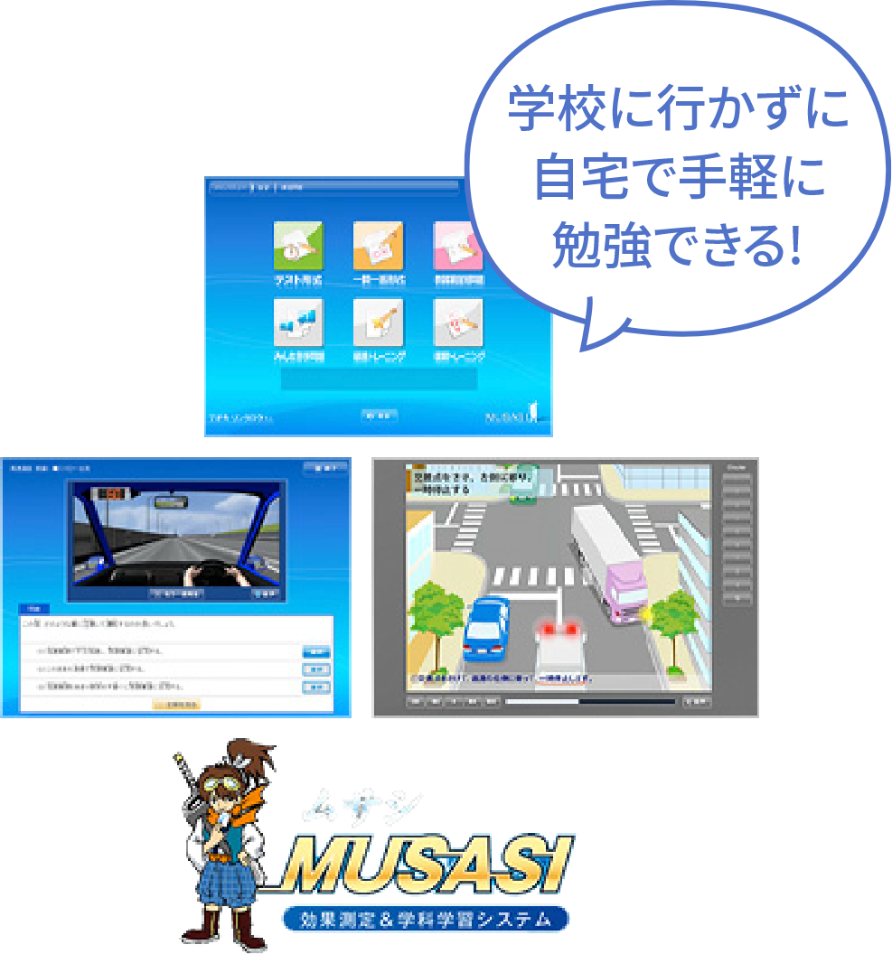 “MUSASI”は、自動車教習所における学科試験(効果測定)や、教習生の方が道路交通法を学ぶことができる“eラーニングシステム”。パソコンはもちろん、スマートフォンやタブレットで、学科試験対策の勉強が24時間できます。